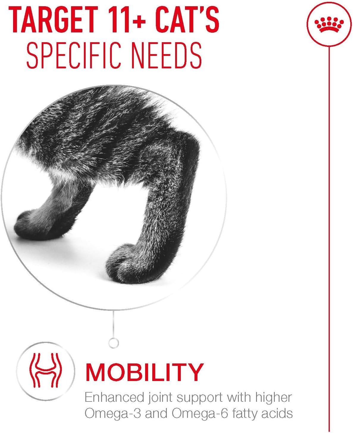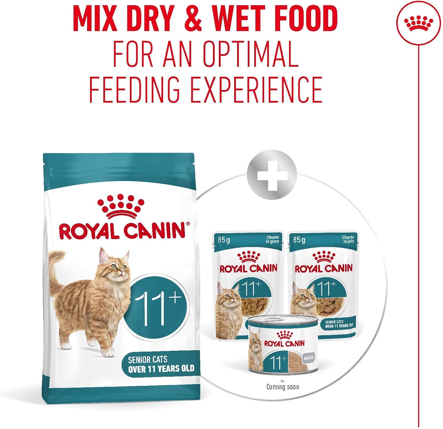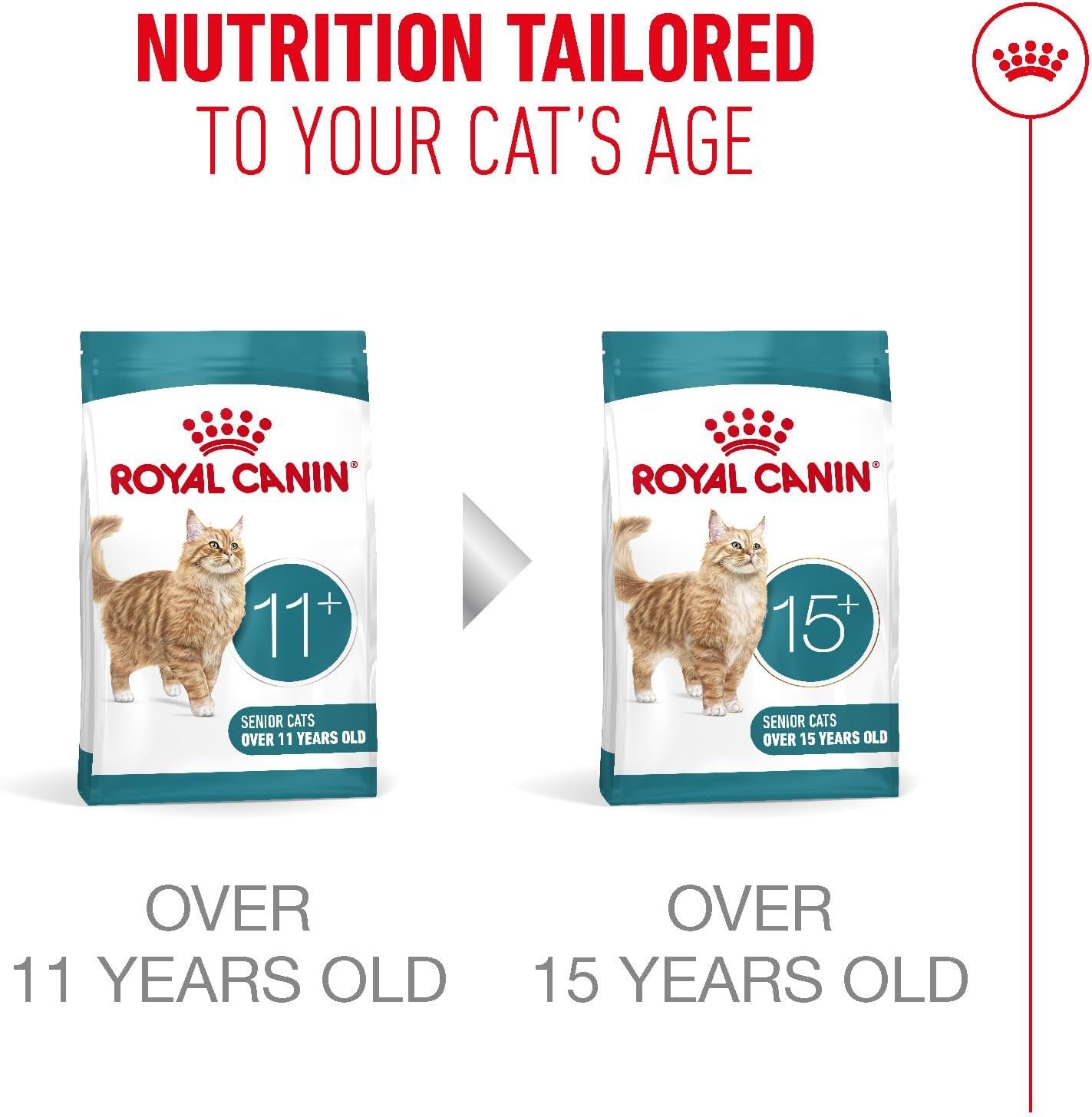 When cats enter their senior years at around 10+ years old, their lifestyle and health needs begin to change. Recognising these changes early can help to maintain their well-being and quality of life as they age. ROYAL CANIN Ageing 11+ is a dry kibble diet suitable for cats aged 11 and above. This formula offers a precisely balanced blend of nutrients to help maintain their health and vitality as they enter their senior years. Easy-to-eat texture: Designed for—and tested with—senior cats, ROYAL CANIN Ageing 11+ features easy-to-eat kibble to give your cat an enjoyable mealtime experience. HealthyAge7TM Complex: This formula, featuring our HealthyAge7 Complex, provides a precise nutritional blend designed to help maintain seven key dimensions of health and vitality in cats over the age of 11. Appetite and weight: Highly palatable and energy-rich to support a healthy appetite and help maintain an ideal weight. Digestion: Contains prebiotic fibres and highly digestible proteins to support healthy digestion. Mobility: Features EPA & DHA and chondroitin to support joint health and mobility. Skin and coat: The inclusion of linoleic acid and zinc helps maintain skin and coat health. Kidneys: Contains high-quality protein and adapted phosphorus levels to support kidney health. Brain and vision: Includes tryptophan, EPA & DHA, taurine, and vitamin A to support cognitive function and vision. Immunity: Contains vitamins C & E, lutein, taurine, beta-carotene, and lycopene to help support the immune system. Mix-feeding your senior cat ROYAL CANIN Ageing 11+ is available in a variety of textures, including chunks in gravy and chunks in jelly. These options can enhance mealtime enjoyment and bring added variety to your cat’s diet, making them ideal for a balanced mixed feeding approach.